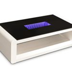 Besonderer Blickfang ist die schwarze Glasplatte über der Ablagefläche, die im Kontrast zum weißen Holztisch steht, sowie der rechteckige Ausschnitt mit effektvoller 3D-LED-Beleuchtung
