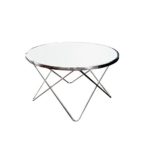 Dieser Couchtisch kombiniert opal weißes Glas und glänzendes Chrom zum Retrodesign