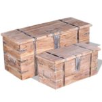 Sie verfügen über eine vordere Verriegelung und zwei seitliche Handgriffe. Die Aufbewahrungstruhen sind aus Massivholz handgefertigt. Der Lieferumfang umfasst 2 Aufbewahrungstruhen.