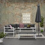 Hochwertige Dinning-Lounge mit Aluminium-Rahmen, dank des hohen Tisches perfekt auch zum dran Speisen geeignet.