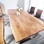 Back to nature – Entdecken Sie unseren großen Esstisch “MAMMUT” mit seiner naturbelassenen Tischplatte! Als besonderes Highlight wurden die Kanten des Tisches so bearbeitet, dass der ursprüngliche Charakter und natürliche Eindruck einer Scheibe eines riesigen Akazienbaumes entsteht. Als hätte man einen großen Baum genau in der Mitte durchgesägt, um die Oberplatte daraus zu fertigen! Möglich macht dies eine speziell entwickelte Maschine, die das Holz noch im ursprünglichen Zustand mit der Rinde auf die gewünschte Plattenstärke, bzw. -dicke zuschneidet. Erst nach einer längeren Trocknungsphase wird danach in einem aufwändigen Verfahren, zum einen die Rinde entfernt, zum anderen die Kanten so fein abgeschliffen, lackiert und oberflächenversiegelt, dass Sie mit Ihren Freunden und Verwandten unbeschwerte Abende beim Essen mit diesem Esstisch genießen können. Als letzte Arbeitsschritte wird die 6cm dicke Platte einer eingehenden Qualitätskontrolle unterzogen und etwaige rauhe Stellen nochmals in Handarbeit nachgeschliffen und poliert. In Kombination mit dem hochwertigen Kufengestell im Industrial Look, die aus verchromten Stahl bestehen und als Tischbeine fungieren, wird der Tisch zu einem optimalen Treffpunkt in Ihrem Esszimmer werden! Lassen Sie sich vom Nature Style inspirieren und entdecken Sie weitere trendige Esstische aus der Riess Ambiente Kollektion. Die Tischplatte ist bei uns ca. 3,5 cm dick – vergleichen Sie!