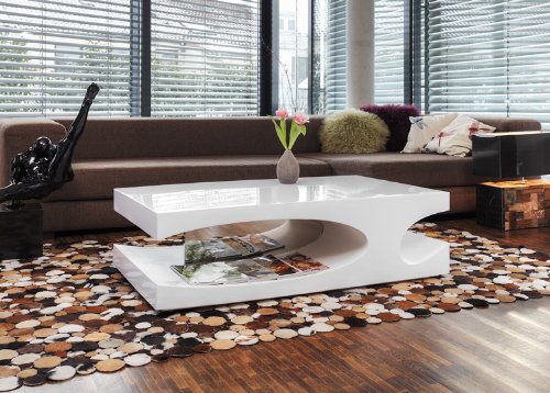 Beim Couchtisch Julie CT Designer fällt sofort die untypische Form mit den geschwungenen Ausschnitten ins Auge. Abgerundet wird das Bild durch die weiße Oberfläche, außen in hochglanz und im Inneren in matt. Die seitliche Aussparung bietet ganz nebenbei noch weitere Stellfläche – praktisch und vielseitig.