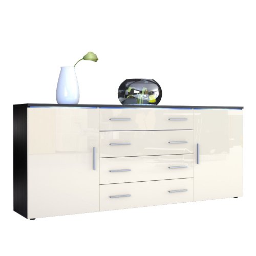 Das Sideboard Faro V2 spricht eine klare Sprache. Gradlinige Formen und ein legeres Design schaffen eine gemütliche Atmosphäre die in diesem Falle auch noch viel Stauraum bereithält. Dieses ausgewogene Sideboard integriert 2 Türen und 4 Schubladen und bildet somit eine ideale Aufbewahrung für vielerlei Wohnaccessoires. Für eine bessere Übersicht befindet sich hinter jeder Tür ein flexibler Einlegeboden. Einen eleganten Blickfang bildet hier der Oberboden mit seiner integrierten Zierglasleiste. Diese erweitert das Sideboard um eine luftige Komponente und mit der optionalen Beleuchtung verleiht es diesem auch noch einen edlen Touch.