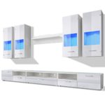 Dieser Wohnwand-Komplettsatz wird eine ausgezeichnete Ergänzung zu Ihrem Wohnzimmer sein, da er Ihren Wohnraum ohne Kompromisse beim Stil optimieren wird. Das Set bestehend aus 4 Wandschränken, 2 Lowboards, 1 TV-Schrank und 1 Wandregal bietet ausreichend Platz für Ihre Multimedia-Geräte, Bücher und kleine Gegenstände aller Art. Es ist auch ideal für die Ausstellung von dekorativen Objekten, Fotorahmen oder sogar Topfpflanzen. Die Lowboards und TV-Schrank mit Klapptüren bietet viel Platz, um Bücher, wichtigste Dinge, DVD-Player, Medienträger, etc. gut organisiert zu halten. Die Wandschränke verfügen über zwei Regale mit energieeffizienter blauer LED-Beleuchtung, um eine stimmungsvolle Athmosphäre zu schaffen. Unser Wohnwand-Set ist aus hochwertigen Spanplatten in mattweißem Finish gefertigt, während die hochglänzende Oberfläche der Frontpaneele den zeitgemäßen Look dieses Sets ergänzt. Dadurch passt das Set zu jeder Einrichtung. Die Montage ist ganz einfach. Lieferung inklusive Montagezubehör.