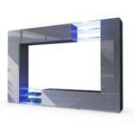 Hinter den hochwertigen Hochglanzfronten befinden sich zahlreiche ausgeklügelte Ablagemöglichkeiten. Auf der rechten und linken Seite der Wohnwand befinden sich Stauraumelemente mit je zwei Einlegeböden hinter den Türen. Unten rechts und oben links gibt es zudem noch zwei Klappenelemente mit je zwei weiteren Fächern. Als designtechnisches Highlight werden die Elemente an zwei Stellen von dekorativen Glasregalen verbunden. Diese können mit der optional erhältlichen LED-Beleuchtung akzentuiert werden. Die LED Beleuchtung in RGB besteht aus 6 Glaskantenclips. Die 16 verschiedenen Farben können über die mitgelieferte Fernbedienung gesteuert werden.